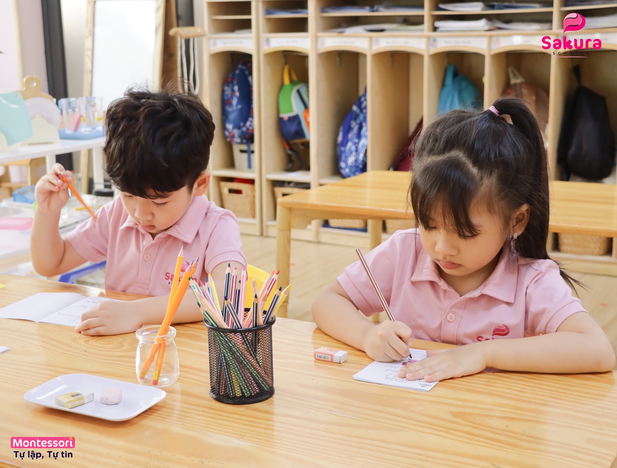 Tại Sakura Schools, giáo viên luôn chăm chút, chuẩn bị môi trường lớp học sẵn sàng và thu hút sự khám phá của trẻ. Các giáo viên cũng tôn trọng nhịp độ phát triển của mỗi cá nhân trẻ bằng cách xây dựng lộ trình cá nhân hóa học tập. Qua đó, trẻ không bị “ép học” hay “nhồi nhét” kiến thức mà được lựa chọn học theo tốc độ cá nhân nhưng vẫn đảm bảo sự phát triển tối đa trong giai đoạn nhạy cảm ngôn ngữ. Trẻ được đọc sách, kể chuyện, ghi chú, viết tên đồ vật, làm cuốn sách nhỏ, viết thư,… Từ đó, ngôn ngữ trở thành một phần sống động trong đời sống lớp học, chứ không phải là một nhiệm vụ học tập khô khan.